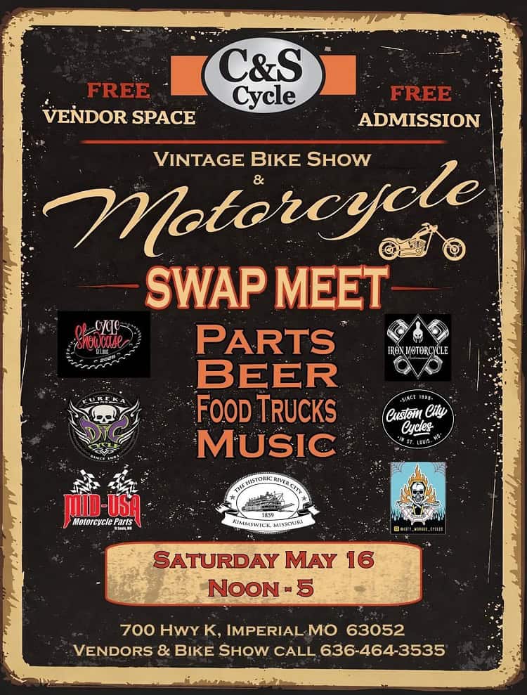 2026sat16may12:00 pm5:00 pmVintage Bike Show & Motorcycle Swap MeetImperial, MO12:00 pm - 5:00 pm C&S CycleEvent TypeEvent,Show & Shine,Swap Meet